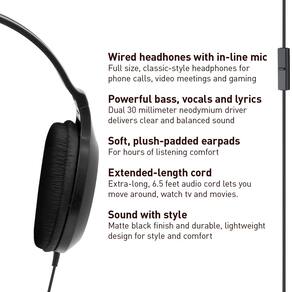 Controle de volume | MicrofoneFones de ouvido leves com fio Panasonic com microfone, som e XBS para graves extras, cabo longo, conector de 3,5 mm para telefones e laptops — RP-HT161M (preto) — Fones de ouvido com fio e microfone: os fones de ouvido de estilo clássico em tamanho real oferecem som balanceado de alta frequência, igual aos fones de ouvido mais caros, para máximo valor e horas de diversão auditiva; o microfone embutido permite atender chamadas com facilidade. Usos específicos do produto: Filmes e jogos - Baixo, vocais e letras poderosos: unidades duplas de driver de neodímio de 30 milímetros suportam facilmente até Entrada de potência máxima de 1000 Mw para graves satisfatórios, além de agudos de média e alta frequência para vocais e letras nítidos - Acolchoada para maior conforto: fones de ouvido acolchoados de pelúcia envolvem suavemente todo o ouvido para minimizar o ruído ambiente e as distrações, e uma faixa de cabeça suave e de ajuste rápido se adapta facilmente à cabeça para um ajuste e conforto ideais - Cabo de fone de ouvido extra longo: um cabo de áudio extra longo de 6,5 pés oferece muito de espaço para sentar e relaxar enquanto assiste filmes e TV, e a liberdade de se movimentar enquanto joga - Som de alta qualidade com estilo: elegante e distinto acabamento em preto fosco e design leve e durável adicionam uma aparência clara de estilo e conforto onde quer que você vá