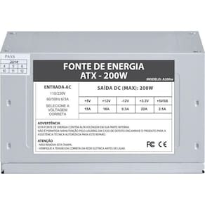Fonte atx 200w vkoem Detalhes Frequência: 50/60hz; Conectores sata e molex; Cooler de 80 mm; Proteção contra sobrecorrente, sobretensão e curto-circuito; Dimensões cxlxa : 15x14x8.5 cm; Conectores: 01 conector atx 20+4p; 03 conectores sata; 02 conectores ide molex ; Tensão de entrada ac : 110/220v; Cabos com 30cm Não acompanha cabo de força : 180 dias. Marca: Não Informado