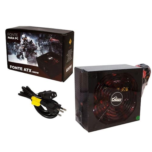 Conectores: 1 conector ATX 20+4 pinos 1 conector ATX 12V 3 conectores SATA 3 conectores IDE 1 conector FDD Conteudo da embalagem: 1 fonte 600W Cowboy ATX SATA 1 cabo de energia Ean: 7898594126328