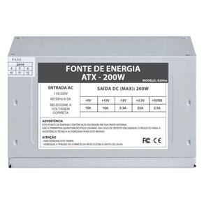 Fonte de energia para computadores ATX 20+4 pinos 200W reais s/ cabo, cooler de funcionamento silencioso embutido, design Própriopara facilitar a ventilação, proteção interna contra curto-circuito, sobretensão, sobrecorrente e sobrepotência.