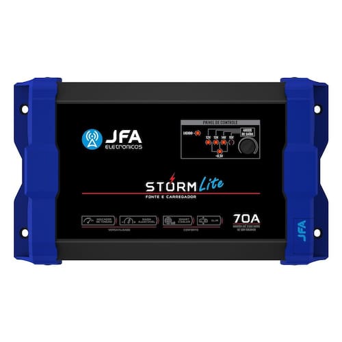 A Fonte e Carregador Storm Lite JFA é a melhor opção para alimentação do seu sistema de som, utilizando ou não baterias, com ótimo custo benefício. Seu diferencial é possuir a voltagem de até 15.2V, com a tensão para equalização dos vasos internos da bateria, única do mercado.
