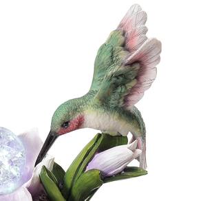 bebendo néctar confortavelmente em um canteiro de flores do jardim - Um toque de bola cristalina que gira e ilumina com luzes LED multicoloridas com um beija-flor lindamente pintado à mão.