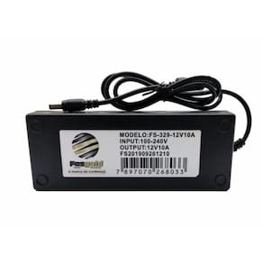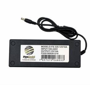 Modelo: FS-329 Especificações: Fonte 12v/10A bivolt automático Modelo: Fonte 12v/10A Tensão de entrada: 90 ~ 260 VAC Automático Tensão de saída: 12 Vdc Corrente de saída: 10A (120 Watts) Proteções: PSI (Protetor contra surto e interferência); Smart Chip (Chip inteligente contra sobrecarga). Garantia: 18 meses, troca expressa.