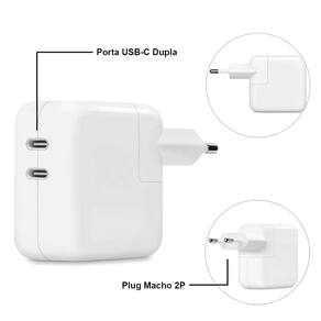 Características: • Porta dupla USB-C para carregar 2 dispositivos ao mesmo tempo; • Potência total: 35W; • Alta eficiência e estabilidade; • Design compacto e elegante na cor branca; • Material resistente e de longa durabilidade; • Plug 2P padrão brasileiro; • Ideal para celulares, tablets e outros dispositivos USB-C; • Carregamento rápido (dependendo da compatibilidade do aparelho).