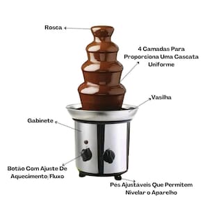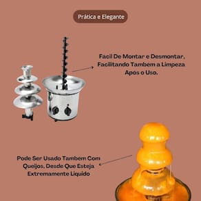 Características Principais: - Tensão: 127V / 60Hz - Potência: 170W - Capacidade: 1200ml - Material: A cascata é feita de aço inoxidável de alta qualidade, garantindo durabilidade e elegância. - Controle de Temperatura: Ajuste a temperatura conforme sua preferência para manter o chocolate sempre na consistência perfeita. - Modo de Usar: Simples e prático Basta colocar o chocolate derretido na base e ligar o motor. O chocolate é então impulsionado através da torre, criando uma irresistível cascata de chocolate.