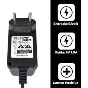 Quais as especificações do produto - input bivolt 110 - 240v 50-60hz 0.33a - output 9v - 1.5a positiva - plug pino 1,7 mm x 4,0 mm - comprimento do rabicho 1,60 metros - cabo de força acompanha - medidas da fonte comprimento = 7,2 cm / largura = 3,9 cm / altura = 4,9 cm - cor preto - atente-se também ao pino conector, ele deve ser igual ao utilizado no seu aparelho comprimento e largura .