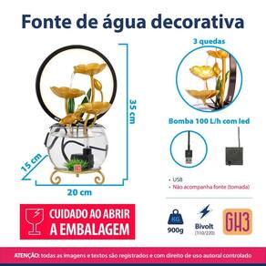 Importante: 1 - Abra a embalagem com muito cuidado, possui peças soltas e frágeis 2 - Troque de água a cada 15 dias e limpe as superfícies com pano úmido ou esponja macia 3 - Nunca deixe a bomba ligada sem água suficiente no reservatório, a falta de água queima a bomba em poucos segundos 4 - Não utilize produtos e esponjas abrasivas 5 - Pode haver pequenas alterações na coloração por ser um produto artesanal 6 - Não acompanha fonte - tomada