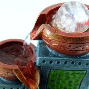 Energias positivas. A fonte de água é símbolo de positividade, amor, felicidade e paz. Capaz de auxiliar nas meditações, está ligado à sabedoria e ao equilíbrio. traz ao ambiente elevação espiritual e paz. Seu ambiente ficará muito tranquilo e sereno, excelente para Feng Shui e energizar ambientes, seja no escritório ou mesmo em casa para atrair boas vibrações nos negócios, relacionamento e vida espiritual.