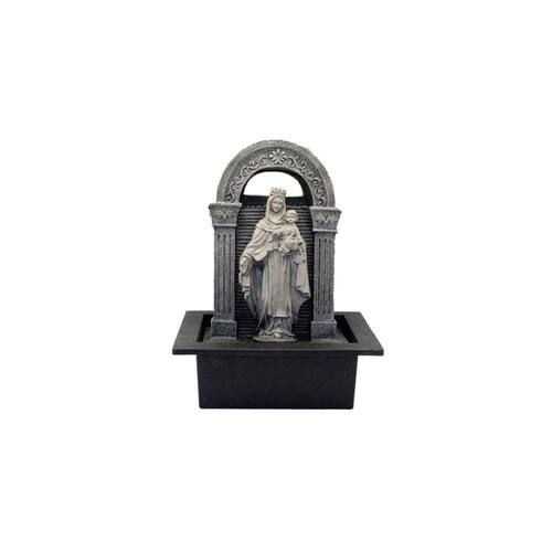 Fonte de água com bela imagem da Virgem com o menino Jesus, seus finos acabamentos fazem desta figura uma decoração ideal para nossa casa ou para presentes, feita com materiais de excelente qualidade. Cor: cinza\ nMaterial: poliresina\ nDimensões: Frente: 20 cms\ nFundo: 18 cms\ nAltura: 26 cms