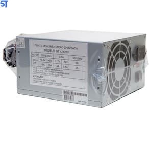 DescriçãoFonte de Alimentação ATX Goldentec 250W RealCaracterísticas Principais:- Padrão ATX 12V;- Bivolt com seleção manual;- Conector SATA;- Conector de saída 20+4 pinos;- Conformidade com as normas RoHS, FCC, CE;- Cabo de força em conformidade com a norma brasileira NBR 14136:2002;- Controle de temperatura silencioso.Conteúdo da embalagem:- 1 Fonte ATX Goldentec 250W