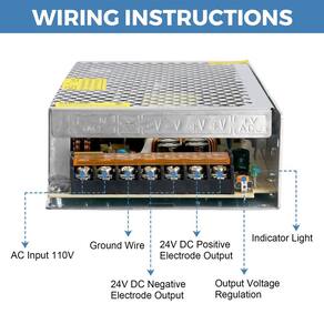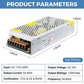 Adaptador de alimentação 24V 5A 120W AC 110-220V para DC 24 volts 5 A Conversor Transformador para LED Strip Light Security System Entrada do parâmetro de alimentação : AC 110V ~ 220V Saída: DC 24V 5A Potência de saída: 120W Corrente de saída máxima: 5A máxima Proteção de segurança Proteção contra superaquecimento, proteção contra sobretensão, proteção contra sobrecarga e proteção contra curto-circuito Nota importante: Não é à prova d'água , use somente em portas. Uso amplo deste adaptador de fonte de alimentação de 24V 5A 120W é bom para roteador sem fio de 24V, luz de faixa LED 5050 3528 24V, creme CCTV, fonte de alimentação de áudio/vídeo e assim por diante - Especificações de alimentação: entrada 110V-220V AC. Saída 24V 5A 120W DC Max; Existe um interruptor, escolha a tensão de entrada 110V/220V que atenda às suas necessidades específicas com o recurso de switch. Já ajustamos o switcher para 110V para nossos EUA - Nota importante: o adaptador de fonte de alimentação de 24V 5A foi projetado para uso interno para atender às suas necessidades de energia. Não o use em sobrecarga, o adaptador de alimentação não é à prova d'água, use em ambientes internos - Alta eficiência: não há ventilador de resfriamento no estojo, funcionamento silencioso, desempenho estável. A caixa de alumínio com muitos orifícios torna a dissipação de calor mais eficiente - Ampla aplicação: o adaptador de alimentação de 24 volts e 5 A é versátil, que pode ser muito procurado por 5050 3528 LED Strip Light/LED Pixel/LED Matrix, câmera CCTV, roteador sem fio, fonte de alimentação de áudio/vídeo e outros dispositivos de 24 V com menos de 120 W - Proteção segura: esta fonte de alimentação tem várias funções de proteção, corte automático de sobretensão, corte de sobrecarga, corte de sobrecorrente, proteção contra curto-circuito. Ele garante a operação segura e estável de dispositivos eletrônicos sob várias condições.