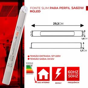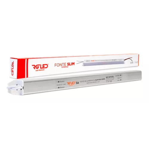 A Fonte de Alimentação Slim 5A 60W 12V - RGLED trabalha diretamente com fitas de LED. Geralmente fonte para fita de LED opera em 12V ou 24V (depender da especificação da fita) e, ainda sim, é necessário levar em consideração a amperagem da fonte driver para realizar o cálculo para casar a fonte ideal para a fita ideal. Posto isso, é desejável operar com folga no cálculo de amperagem x metragem da fita, assim garantimos a vida útil do produto, tornando-o mais confiável e pronto para iluminar sua casa. Sua tensão é de 12V, com potência 60W e seu índice de proteção é IP20.