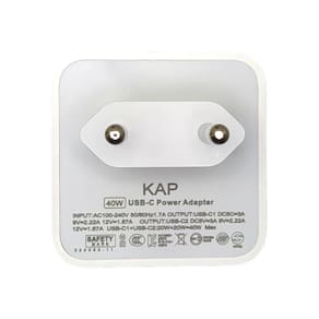 Fonte de carregamento com 02 portas USB Tipo-C, potência total de 40W. Entrada AC 100-240V 50/60Hz 1.7A. Saída individual de 5V=3A, 9V=2.2A, 12V=1.67A por porta. Saída combinada de 20W + 20W = 40W Max.Tipo