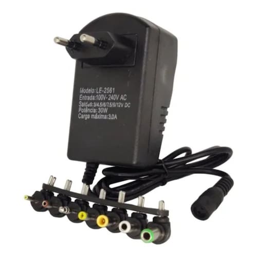 - Compatível com tablets, caixas de som, conversores, hubs, switchs e etc, conforme especificação e pinagem - Potência máxima: 30 Watts - Tensão de saída: 3, 4.5, 6, 7.5, 9 e 12 Volts - Corrente de saída: 3 Ampres máximo - Comprimento do cabo: 60 centímetros - Tensão de entrada: 110V-220V bivolt automático