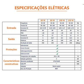 Fonte de Tensão 12V 2,5A - 30W Fonte de tensão com alto desempenho e eficiência, para aplicação principal em iluminação a LED Possui grande capacidade de estabilização e filtros eficientes que garantem ótimo desempenho e segurança, através de tecnologia de ponta. Especificações: Potência Máxima 30W Tensão de saída 12V estabilizada Abas de fixação sim Medida 150 x 56 x 46mm Corrente de saída 2,5A Tensão de Alimentação 90 a 265 VAC Grau de Proteção IP 67 : 01 ano com o fabricante Marca: Não Informado