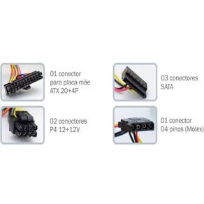 Fonte ez8828c eztfx 300w 80 plus bronze c/cabo - Fonte de alimentação ez tfx-300 80 plus bronze Certificação 80 plus bronze 5 tipos de saídas +12v, -12v, +5v, +3.3v, +5vsb Baixo ruído Alta confiabilidade Função remota liga/desliga Possui pfc ativo Fonte padrão tfx Fonte de alimentação ez tfx-300 Especificações técnicas Eficiência: 85.23% da carga máxima Voltagem: 110220vac full range Frequência: 60hz Ventilação: interna - 80mm cooler Comprimento dos cabos 24p e p4 : p4: 300mm 24p: 300mm Dimensões axlxp : 65x85x175mm Acompanha cabo de energia padrão inmetro - comprimento: 1300mm Especificações da embalagem Embalagem individual com 01 uma unidade Peso líquido: 0,920kg Votar a página inicial Características gerais do produto: Material: metal : 90 Marca: Não Informado Ean: 7908347905169