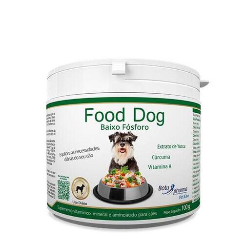 Food Dog Baixo Fósforo 100g Para cães que têm o privilégio de ser alimentado com ingredientes frescos, Botupharma Pet Food Dog Baixo Fósforo foi elaborado para complementar dietas caseiras.Food Dog 100 G Baixo Fósforo Suplemento Para CãesO Food Dog 100g Baixo Fósforo é a suplementação de vitaminas, minerais e aminoácidos para alimentação caseira de cães adultos. Produto desenvolvido para suprir as carências de diversos nutrientes, inclusive cálcio, fósforo e outros minerais e vitaminas, com base no Nutrient Requirements of Dogs and Cats-NRC 2006 e boletim da AAFCO 2014 . A presença de matérias-primas de alta qualidade, como aminoácidos de ótima absorção, minerais quelatados, prebióticos MOS e FOS, cúrcuma, extrato de yucca, colina, vitaminas A, B, D, E e K, transforma o alimento caseiro em uma dieta de excelente nutrição e equilibra as necessidades diárias do seu cão.Composição:Ácido Fólico, Ácido Pantotênico, Biomassa de Microalgas , Biotina, Carbonato de Cálcio, Carbonato de Potássio, Cloreto de Colina, Cobalto Aminoácido Quelato, Cobre Aminoácido Quelato, Complexo Selênio Aminoácido, Cúrcuma, Extrato de Alecrim, Extrato de Yucca, Ferro Aminoácido Quelato, Fosfato Bicálcico, Fruto-oligossacarídeos, Glicina, Isoleucina, L-Arginina, L-Glutamina, L-Lisina, L-Metionina, L-Treonina, Magnésio Aminoácido Quelato, Manganês Aminoácido Quelato, Niacina, Parede Celular de Levedura, Prolina, Tirosina, Transquelato de Iodo, Valina, Vitamina A, Vitamina B1, Vitamina B12, Vitamina B2, Vitamina B6, Vitamina D3, Vitamina E, Vitamina K3, Zinco Aminoácido Quelato.Quem ama cuida: Nós da Novo Pet que prezamos pela saúde e bem estar do seu pet, orientamos que, antes de adquirir algum medicamento ou suplemento, consulte um médico veterinário de sua confiança.
