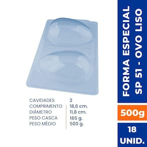 Quantidade: 01 Cavidade: 2 Comprimento: 186 mm x Diâmetro: 118 mm Peso casca: 165 g Peso médio: 500 g Modelo: Especial (3 Partes)