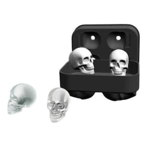 Forma De Gelo Caveira Para fazer gelo ou chocolate em formato de caveiras. O seu drinque com um toque especial. Cada forma faz 4 caveiras 4,6 x 4 cm. Confeccionada em silicone flexível, suporta até 240 graus centígrados não expor diretamente as chamas Dimensões 10 x 8 x 4,5 cm.