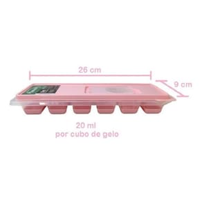 Informações Total de 240ml distribuídos em 12 cubos 20ml por cubo de gelo . Muito fácil e prático de se usar, feito de material não-tóxico, a forma de gelo com tampa evita aquele pinga-pinga pela casa na hora de levar a forma ao congelador Material não-tóxico BPA FREE / Livre de BPA , sem cheiro, durável e resistente, fácil de limpar e fácil de manusear. Cor: Rosa Material: Silicone