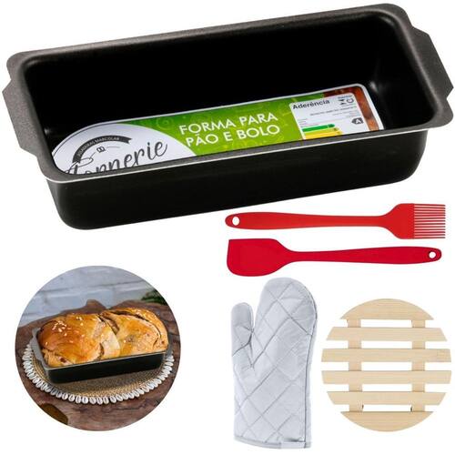 01 Forma de Pão 900ml 01 Luva Térmica de Cozinha 01 Pincel Culinário de Silicone 01 Descanso de Panela 01 Espátula de Silicone