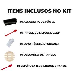 01 Forma de Pão 900ml 01 Luva Térmica de Cozinha 01 Pincel Culinário de Silicone 01 Descanso de Panela 01 Espátula de Silicone