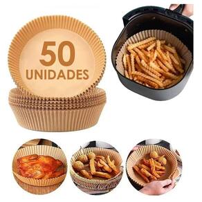 Forma de papel redonda descartável para fritadeira elétrica, forno e micro-ondas. Resistente ao calor até 220°C, superfície antiaderente, embalagem com 50 unidades.Tipo