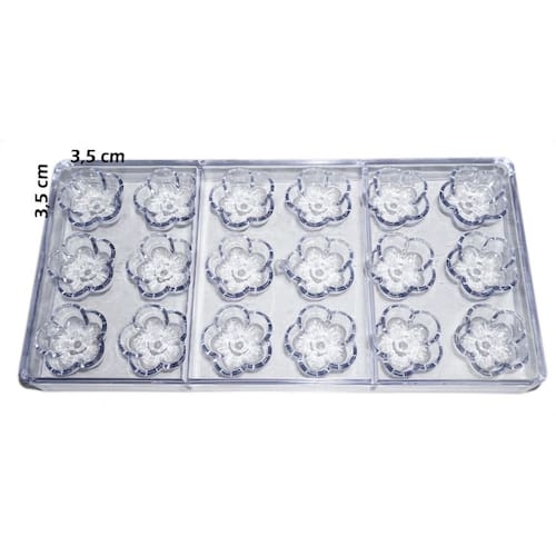 Com 18 cavidades, essa forma permite criar chocolates em formato de flores, com dimensões aproximadas de 3,5 x 3,5 cm cada. É ideal para quem deseja dar um toque especial em suas produções de doces e sobremesas.