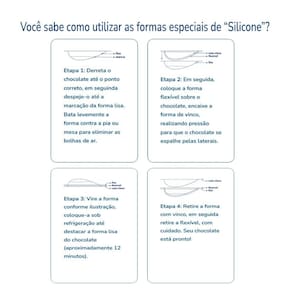 Antes e após o uso da sua forma limpe-as com pano umedecido em água morna. Deixe secar. Nunca use detergente, sabão ou bucha. Limpe a sua forma porto formas entre um processo e outro apenas com papel absorvente. Mantenha as embalagens fora do alcance de crianças. Conservar fora da luz solar e não expor a temperatura superior a 50ºc.