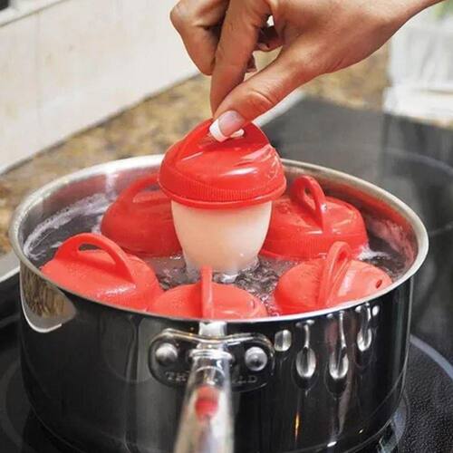 - O processo de cozimento é similar ao cozimento do ovo com a casca; - Unte a forma de silicone com manteiga ou margarina; - Quebre o ovo e coloque dentro da forma de silicone; - Caso queira rechear ou temperar adicione os ingredientes na forma; - Encha uma panela com água fria para que as formas não toquem o fundo da panela; - Deixe ferver pro aproximadamente 10 minutos; - Retire as formas da água com cuidado; - Solte a tampa da forma e retire o ovo cozido virando a forma com a abertura para baixo; - Caso seja necessário, utilize uma colher ou espátula para ajudar a soltar o ovos da parede interna da forma.