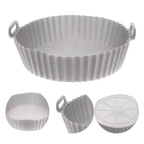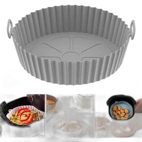 Especificações: Tamanho aproximado: 4,5x18cm de Peso aproximado: 60g Tipo de produto: forma redonda com alca para air fryer / fritadeira eletrica Cor: cinza e vermelho Composição: silicone