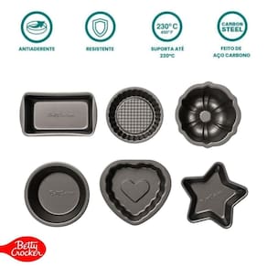 Prepare receitas variadas com o jogo de 6 forminhas Betty Crocker Jogo 6 Forminhas Mini Bolo Quiche Pão Muffin, ideal para assar mini bolos, muffins, quiches, tortinhas e pães. O conjunto oferece praticidade no dia a dia, com fácil desenforme, cozimento homogêneo e limpeza simples. Produzidas em aço carbono de 0,4 mm com revestimento antiaderente, as formas ajudam a deixar as receitas douradas por igual e saem inteiras da forma. São indicadas para uso em preparos doces e salgados, atendendo desde lanches rápidos até sobremesas especiais. A tradição da marca Betty Crocker em confeitaria caseira reforça a qualidade e a confiabilidade do produto para uso doméstico.