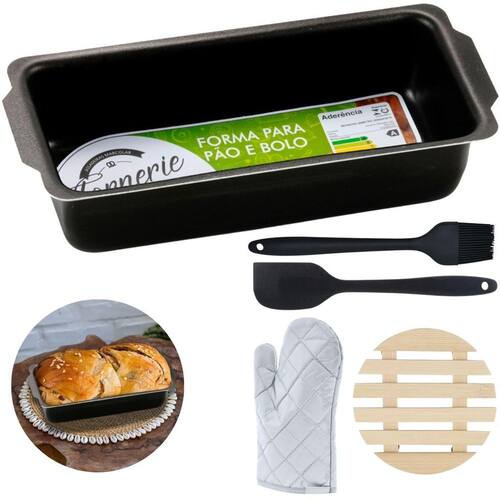 01 Forma de Pão 1,3L 01 Luva Térmica de Cozinha 01 Pincel Culinário de Silicone 01 Descanso de Panela 01 Espátula de Silicone