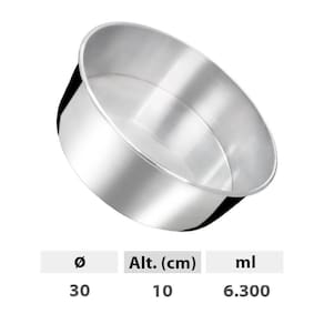 Pode ser utilizado em qualquer forno para o cozimento de assados, bolos e tortas, doces e muitos. Ideal para preparar, armazenar e servir os mais diversos tipos de alimentos, forma de alumínio perfeita para facilitar a rotina diária na cozinha. Desenvolvida com alumínio de excelente qualidade, é resistente, não absorve cheiro, cor ou sabor dos alimentos. Diâm. - 30cm Alt. - 10cm ML - 6.300 ml