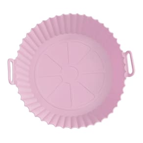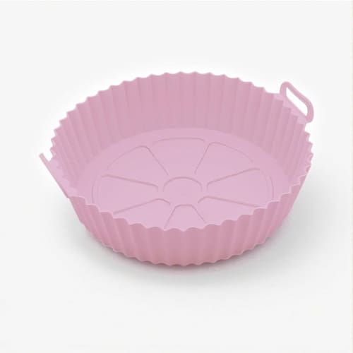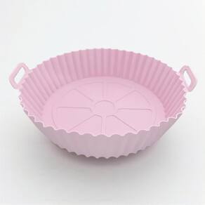 Forma reutilizável de silicone rosa para air fryer, 16cm de diâmetro. Evita que resíduos grudem no cesto, facilitando a limpeza e prolongando a vida útil do equipamento. Fabricada em silicone de alta qualidade, livre de BPA, resistente a altas temperaturas (-40C até 230C), flexível e antiaderente. Possui alças laterais para remoção fácil e segura. Pode ser lavada à mão ou em lava-louças. Não deforma e não solta odores.Tipo