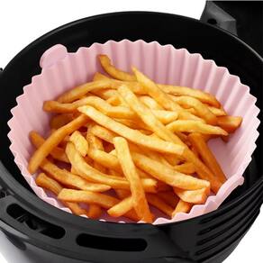 Forma reutilizável de silicone rosa para air fryer, 16cm de diâmetro. Evita que resíduos grudem no cesto, facilitando a limpeza e prolongando a vida útil do equipamento. Fabricada em silicone de alta qualidade, livre de BPA, resistente a altas temperaturas (-40C até 230C), flexível e antiaderente. Possui alças laterais para remoção fácil e segura. Pode ser lavada à mão ou em lava-louças. Não deforma e não solta odores.Tipo