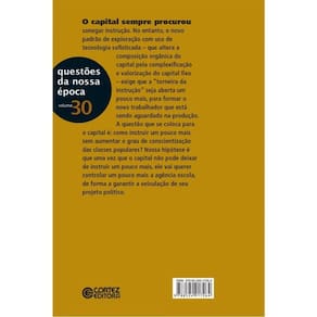 O capital sempre procurou sonegar instrução. No entanto, o novo padrão de exploração com uso de tecnologia sofisticada - que altera a composição orgânica do capital pela complexificação e valorização do capital fixo - exige que a "torneira da instrução" seja aberta um pouco mais, para formar o novo trabalhador que está sendo aguardado na produção. A questão que se coloca para o capital é: como instruir um pouco mais sem aumentar o grau de conscientização das classes populares? Nossa hipótese é que uma vez que o capital não pode deixar de instruir um pouco mais, ele vai querer controlar um pouco mais a agência escola, de forma a garantir a veiculação de seu projeto político. Marca: CORTEZ*