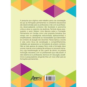 A pesquisa que originou este trabalho partiu da constatação de que as formações permanentes no ambiente educacional são desenvolvidas para os professores e não com os professores, desencadeando contextos não favoráveis à autonomia crítica e ativa no exercício da docência. Partindo desse pressuposto, o autor Robson Lima discorre sobre a Formação Permanente em Escolas como uma proposta formativa que rompe com os paradigmas reducionistas, aplicacionistas e simplificadores, valorizando as necessidades que demandam do contexto de atuação dos docentes. Nessa óptica, a escola é vista como lócus de socialização e compartilhamentos, mediados por assessores ou formadores do próprio contexto. Não se trata apenas do espaço físico onde a formação deve ocorrer, mas de uma mudança de enfoque no processo formativo, cuja transformação se dá a partir de dentro, na própria instituição educativa com os profissionais que nela atuam. A obra destina-se a professores, técnicos em educação, acadêmicos e pesquisadores, lançando-lhes um novo olhar para as formações permanentes.