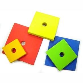 Composto por 1 base com 1 pino e 5 peças quadradas de tamanhos diferentes; todas de madeiraPINUSreflorestada e pintada com tintas atóxicas.