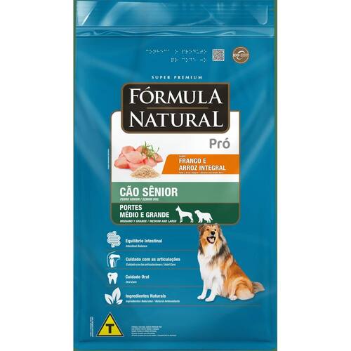 Desenvolvida por médicos veterinários, a linha Fórmula Natural Pró oferece uma nutrição de alta qualidade para cães. Fórmula Natural Super Premium Pró Cão Sênior Portes Médio e Grande Sabor Frango e Arroz Integral auxilia na saúde intestinal, contribui para uma pelagem bonita e saudável, além de promover cuidado com a saúde oral e das articulações. Disponível no sabor frango e arroz integral, oferece todos os cuidados para promover saúde, longevidade e qualidade de vida aos cães adultos. Formulada com ingredientes naturais, não contém corantes e aromatizantes artificiais.