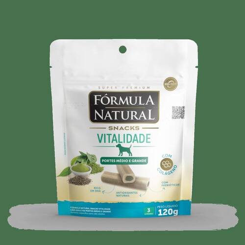 Fórmula Natural Snacks Vitalidade Cão Adulto Médio/Grande - 120G Fórmula Natural Snacks é uma linha de petiscos com ingredientes naturais e funcionais, que visa atender aqueles tutores que querem oferecer um cuidado adicional na nutrição dos seus cães. Saborosos e com textura diferenciada, a linha conta com quatro versões: , vitalidade, pele e pelagem e dental. Fórmula Natural Snacks Vitalidade contém antioxidantes naturais, prebióticos e DHA, uma combinação que auxilia na vitalidade dos cães. Especialmente aqueles mais ativos, cães idosos, cães de exposição ou em situações de maior exigência física. -com prebióticos -antioxidantes naturais -spirulina -rico em DHA -com colágeno Composição básica: Farinha de vísceras de aves, colágeno hidrolisado 0,3% , sulfato de condroitina 0,03% , sulfato de glicosamina 0,15% , farinha de trigo, farinha de arroz, celulose, sementes de chia, aveia, espinafre, hidrolisado de fígado de suíno, biomassa de microalgas Spirulina platensis , biomassa de microalgas Schizochytrium sp. , parede celular de levedura, frutooligossacarídeos, galactooligossacarídeos, gelatina, glicerina, goma xantana, lecitina de girassol, propionato de cálcio, sorbato de potássio, extrato de alecrim, extrato de chá verde, extrato de hortelã, vitaminas E e C , minerais organozinco, organoselênio, organomanganês , concentrado de tocoferóis 0,01% Níveis de : Umidade Máx. 180 g/kg 18,00% Proteína Bruta Mín. 80 g/kg 8,00% Extrato Etéreo Mín. 25 g/kg 2,50% Matéria Fibrosa Máx. 50 g/kg 5,00% Matéria Mineral Máx. 90 g/kg 9,00% Cálcio Máx. 20 g/kg 2,00% Cálcio Mín. 5.000 mg/kg 0,50% Fósforo Mín. 5.000 mg/kg 0,50% Mananoligossacarídeos Mín. 90 mg/kg Frutooligossacarídeos Mín. 180 mg/kg Galactooligossacarídeos Mín. 110 mg/kg Betaglucana Mín. 230 mg/kg DHA Mín. 300 mg/kg
