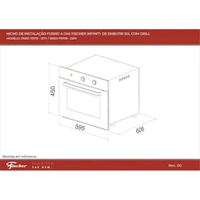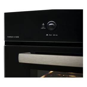 Forno a gás de embutir com capacidade de 50 litros, função grill, controle de temperatura de 160°C a 260°C, iluminação interna, porta de vidro duplo e revestimento interno EasyClean.Timer