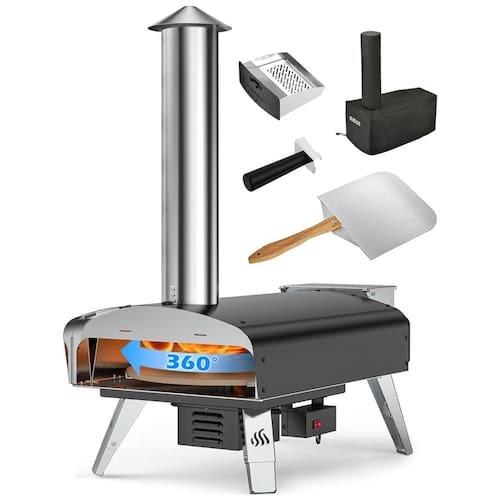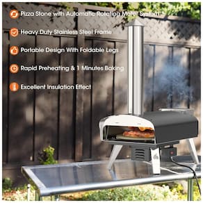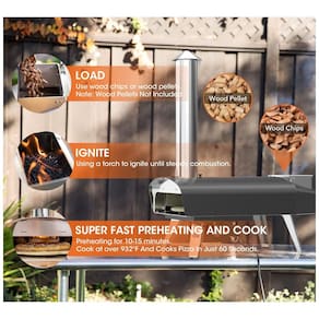 Forno a lenha externo portátil com rotação automática e pedra para pizza. Pré-aquecimento em 10-15 minutos até 500°C. Assa pizza em 1 minuto. Suporta madeira e pellets. Montagem rápida sem ferramentas. Inclui pedra para pizza, casca de pizza (30x34cm) e capa protetora.Forno autolimpante