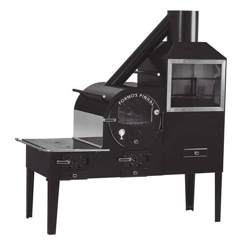 Forno acoplado 3 em 1 com fogão a lenha e churrasqueira. Acabamento em tinta de alta temperatura, interior em aço inox, porta em ferro fundido com visor de vidro temperado. Inclui termômetro e iluminação interna.Tipo