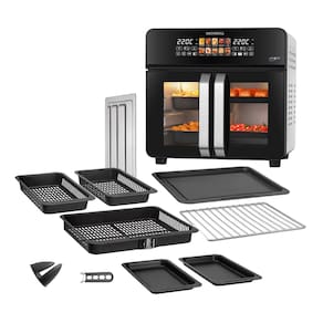 Air Fryer Forno com divisória Dualzone para preparar duas receitas ao mesmo tempo. Função de sincronização. Assa e frita sem óleo. Portas de vidro duplo. Painel touch colorido com 10 funções pré-programadas. Design em inox. Luz interna. Revestimento antiaderente. Segurança: Vidro duplo, French Door, desligamento automático, alarme sonoro, painel touch, luz interna, divisória segura, pés antiderrapantes.Forno autolimpante