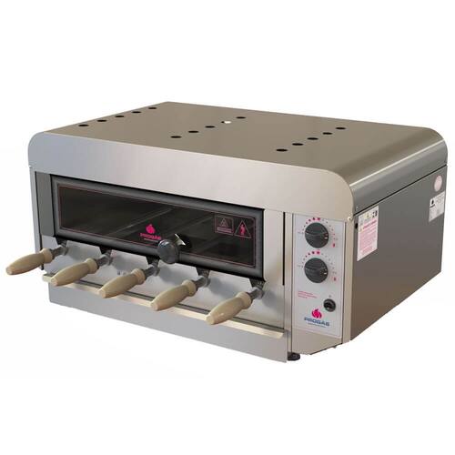 INFORMAÇÕES GERAIS - Estrutura e acabamento interno em aço inox escovado; - Gaveta coletora de gordura para facilitar o manuseio e a limpeza; - Controle progressivo de chama máxima e mínima; - Porta de vidro temperado. - Equipamento bivolt; - Queimadores infravermelhos e alimentação de gás em baixa pressão; - Capacidade para 05 espetos rotativos, sendo 3 largos para carnes e 2 estreitos para coração de galinha, que acompanham o produto; - Potência: 108/73 W - Consumo Elétrico: 0,1 Kw/h. - Consumo de gás por queimador: 180 g/h