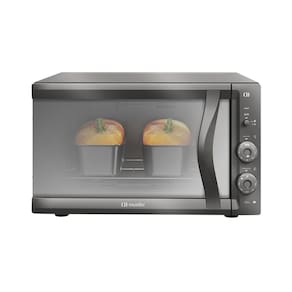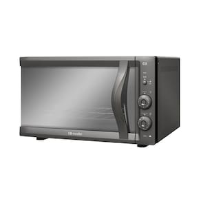 Forno de bancada elétrico Mueller com capacidade de 50 litros, grill, timer de 120 minutos, variação de temperatura de 50ºC a 300ºC, luz interior e bandeja removível para resíduos.Forno autolimpante