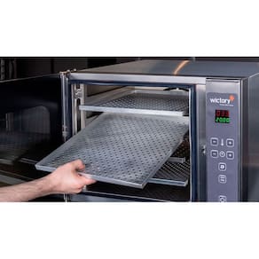 Possui 4 assadeiras de tamanho 35 x 35 cm, em alumínio perfurado, permitindo uma maior produtividade por fornada.
