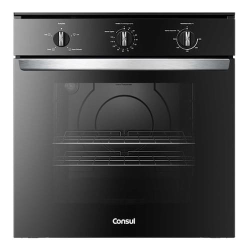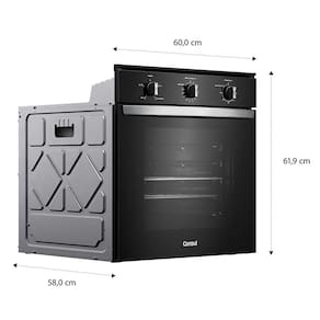 Forno de embutir com design moderno em preto, 84L de capacidade, timer com desligamento automático, grill elétrico, 2 prateleiras com 5 alturas ajustáveis e revestimento esmaltado para fácil limpeza.Timer