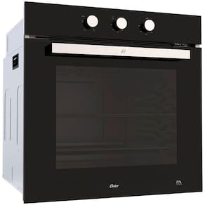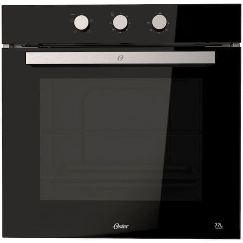 Forno de embutir elétrico Oster Black com capacidade de 77 litros, funções pré-programadas, timer de até 120 minutos, vidro triplo, convecção e controle de temperatura ajustável de 50°C a 250°C.Timer